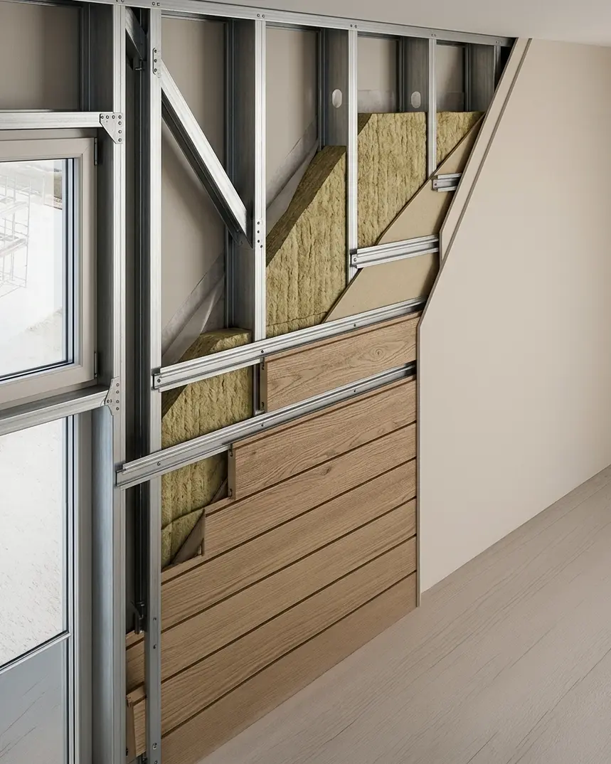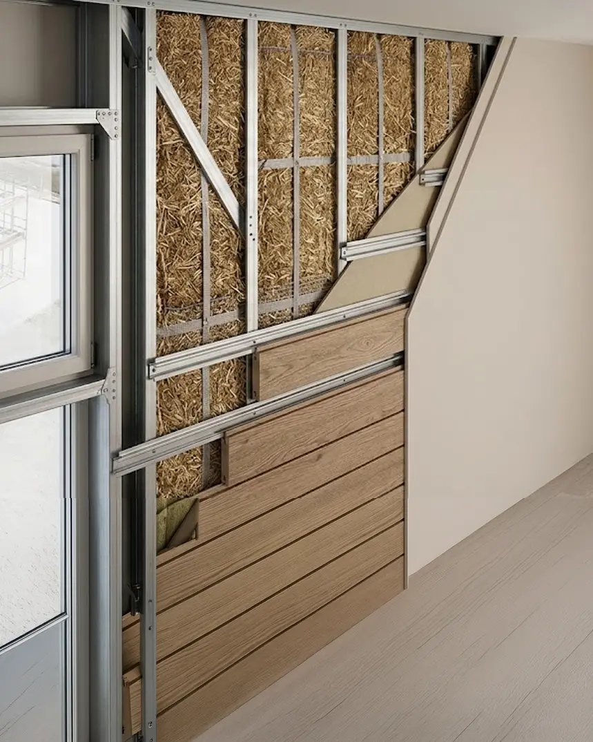 Basado en montantes de madera maciza C24 recubiertos por tableros técnicos (OSB y Superpan), con el espacio interior relleno de aislamiento natural de fibra de madera